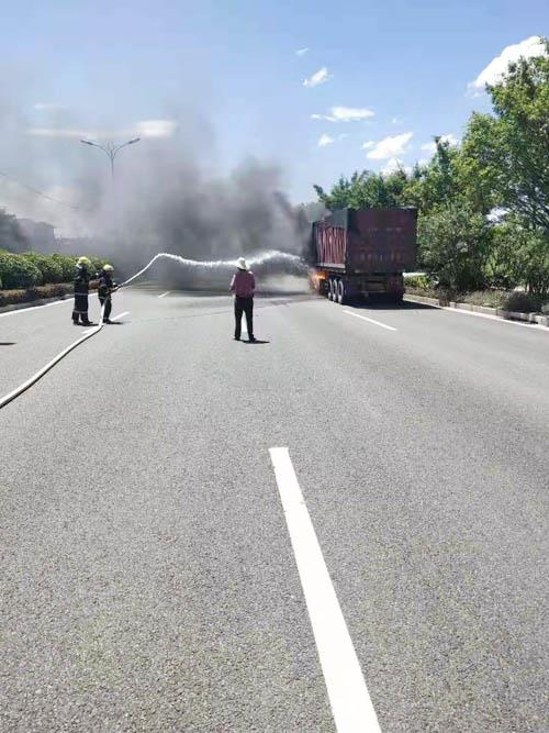 本报讯 日前,新度派出所接到群众报警称,在辖区内城港大道壶山路红绿灯附近100米处一辆货车自燃,现场无人员被困。接到报警后,该所民警和联防队消防员迅速赶赴现场。在事故现场,一辆满载货物的货车左侧车头与后挂连接处的轮胎燃着熊熊烈火,民警立即封路,并疏散围观群众,联防队消防员迅速扑灭大火。经询问货车司机老阮得知,该车已连续作业多时,遂引发“自燃”。由于处置及时,除了着火轮胎有损坏外,车体其它地方完好无损,也没有造成人员伤亡。 (时报记者 翁志鹏 通讯员 陈娟)
