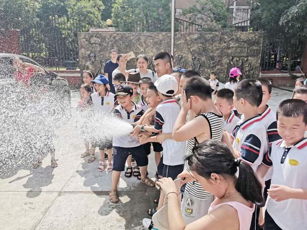 在家长的带领下,孩子们跟随消防指战员对消防防护装备和消防车辆进行参观和体验。在消防车面前,讲解员给学生们参观了消防车各种性能与用途。首先印入眼帘的是醒目的红白颜色的消防车,讲解员打开车上的一扇扇小门,给大家讲解消防车上的小秘密:消防器械、高压水枪、灭火器等。小朋友们还认识了许多从未见过的东西,比如穿上后可以保护自己不受毒气危害的隔热服,在火场上用来呼吸的空气呼吸器瓶,并详细的讲解和操作了消防车里的功能。在认识了所有的消防器材之后,讲解员还给学生们讲解了灭火器的使用方法,学生们在消防队员的指导下,学会了如何使用灭火器的正确方法,也亲身参与了体验。