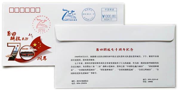 据悉,1949年8月21日,解放军开进莆田,莆田获得解放。为此,莆田市集邮协会制作纪念封1枚,编号为PFN-FJ19-45,发行量为1000枚。纪念封主图为飘扬的五星红旗,把妈祖石像、古谯楼融入数字“70”中,彰显“莆田味道”。为了扩大集邮文化的受众群体,表达集邮界喜迎家乡的喜庆节点,市邮协秘书处通过公众号、微信群、朋友圈等渠道,广泛宣传该封的赠送消息。莆田邮政同时启用2种邮戳配合本次活动,1种是红色的纪念戳,1种是蓝色的邮资机宣传戳,邮戳主图与纪念封如出一辙,但各有特色,令人爱不释手。