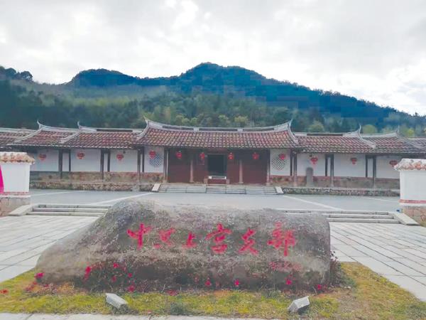 从茂林修竹、风光旖旎的兴角山腰盘陀路缓缓下行,侧目但见山脚下气势恢宏的宫殿式回字形建筑群——馨山书院,古色古香,正殿面阔五间,分下、中、上三层成梯进式,木构架悬山顶,白墙红瓦,由前后大厅、天井、左右两边厢房组成,占地面积约1700多平方米……倏忽就径达偌大的院前大埕,埕中凸起巨石上的“中共上宫支部”6个遒劲厚重的大红字在阳光下熠熠生辉。