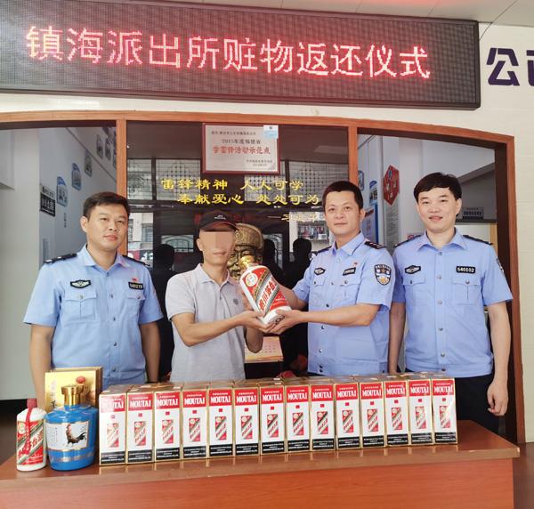 5月28日上午,镇海派出所在所内公开举行退赃仪式,失主陈某拿到失而复得的价值约20万余元的32瓶茅台系列白酒,激动万分,并将写着“罪犯克星、神警雄风”的锦旗送给该所民警,表达谢意。