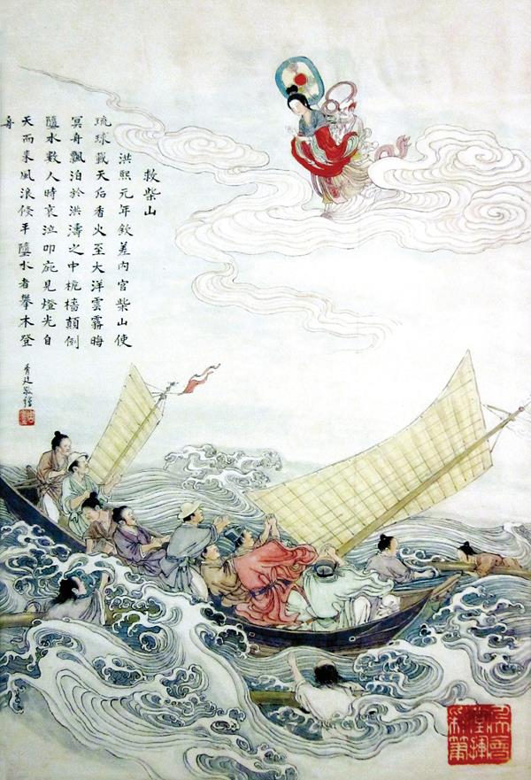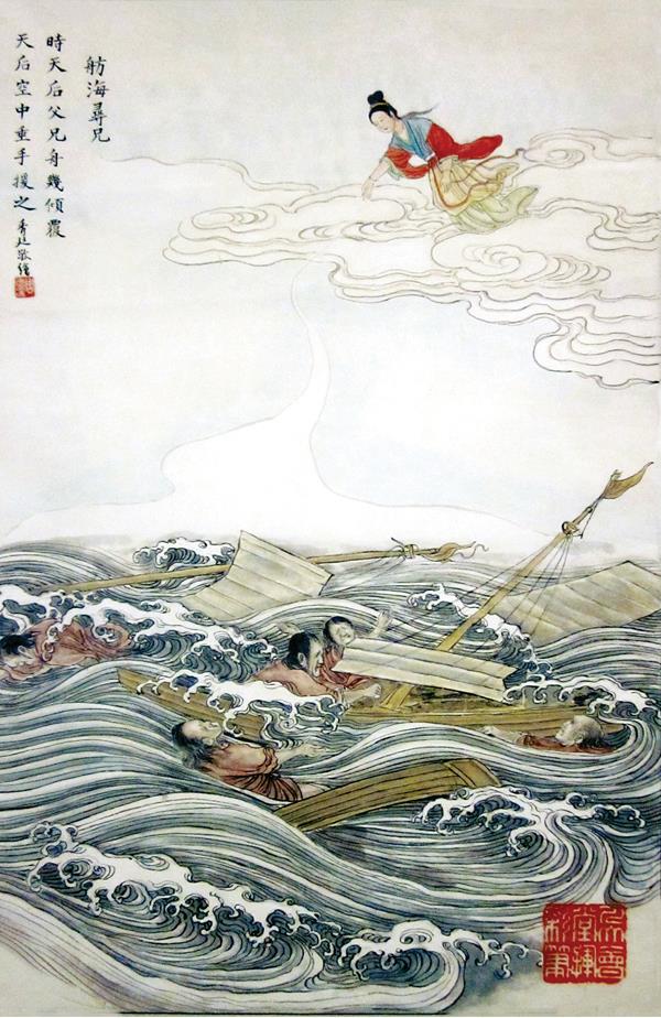 千年守望,妈祖的神格传承和维系着中华民族优秀传统文化的精神,成为全球华人文化认同的标志。所谓妈祖“托梦神助”的说法,正是显示妈祖庇护人民航海安全时的神格形象,转化为航海者的心理因素以产生鼓舞力量,推动其去征服人间危难。比如《机上救亲》描绘秋九月,父亲与兄长渡海北上遇难,妈祖在纺织机上出元神救亲人的动人场景。画面中妈祖在纺织机前织布时似假寐状,而灵魂则出窍到海上拯救父兄,身后的母亲正在拍醒她。虽然《舫海寻兄》(图2)反映了与《天妃显圣录》中“机上救亲”同一则的故事,但是却表现出与其他圣迹故事图像不一样的情景,妈祖冒险出海拯救遇难的父兄时,她身体倾斜几乎与海洋面平行状态,画面要求一切线、形、色的搭配从属于这一大动势线的结构美感。题识为:“时天后父兄舟几倾覆天后空中垂手援之”。随着元、明时期航海交通日益发达,妈祖作为海上安全保护神的地位和声望也随之提升。《周秀廷妈祖故事画册》通过“妈祖显灵”的神格形象来宣扬人类勇于同大自然进行命运搏斗的宏愿,展示了民间信众的善良愿望、美好理想和自强不息的精神,也反映出妈祖信仰对于我国海洋事业的发展与促进。