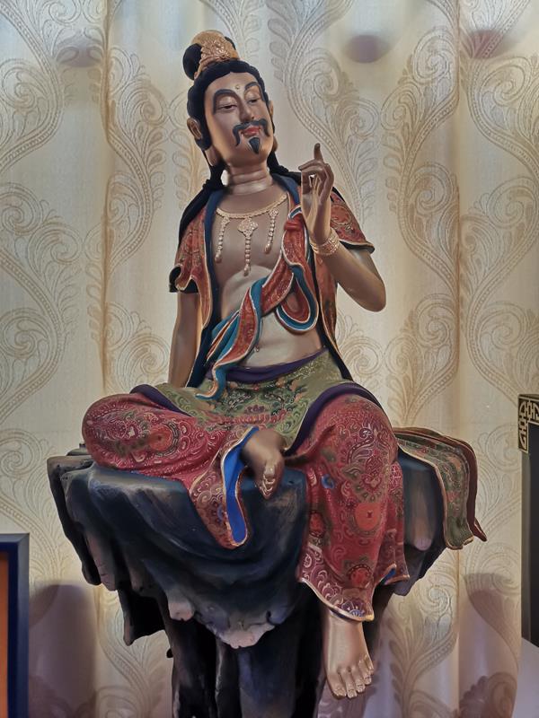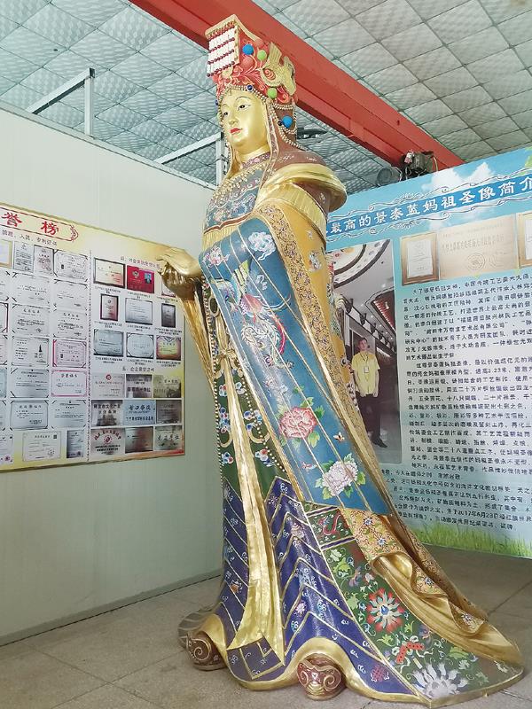 目前在工厂里摆放的是第三尊,是台湾人订做的。由于疫情的关系,无法运输,暂时存放在林辉目前租在新威电子厂的工厂里。林辉说,此尊世界上最高的景泰蓝妈祖像,他只想限量做九尊。我建议他既然获得了世界最高的认证证书,可以做成缩小版的,一尊三十公分左右就行,限量做323尊,给每尊进行编号,让喜欢景泰蓝和妈祖文化的人收藏,也很好。