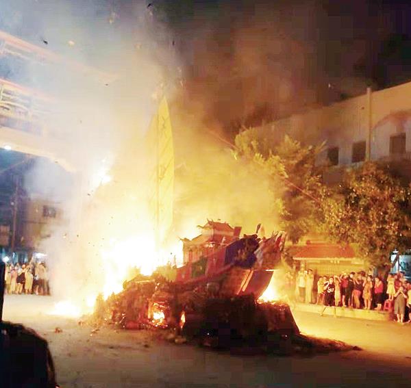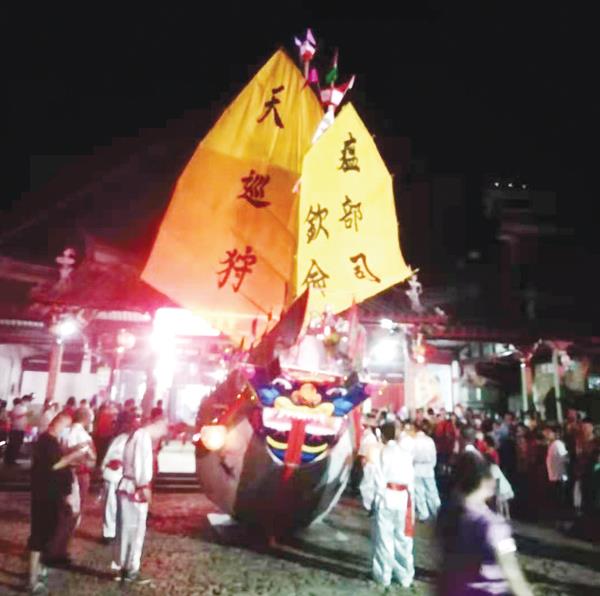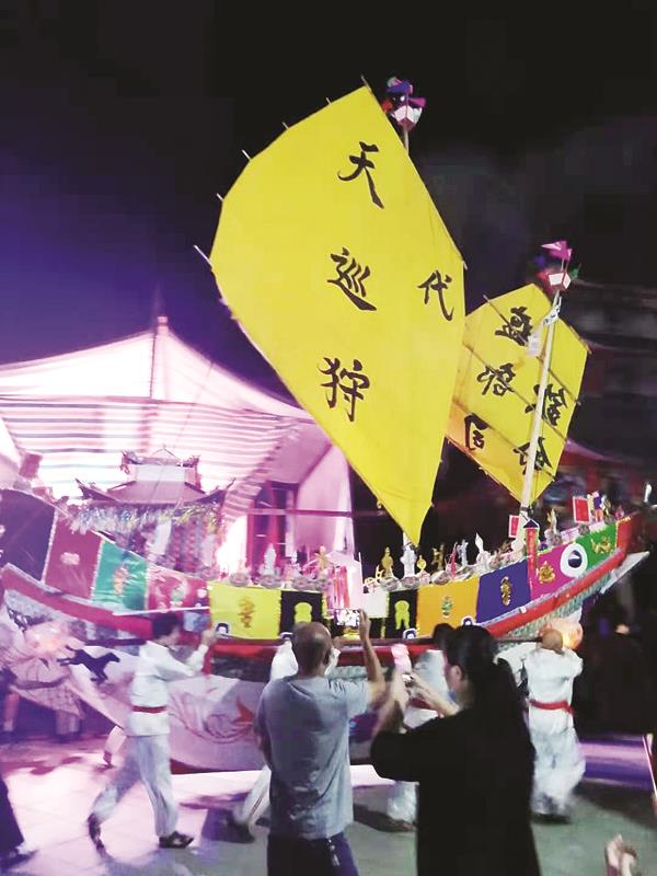 “送王船”仪轨从皂隶舞开场。它原本是远古时代人们驱鬼辟邪的祭祀仪式。紧接着,“送王船”仪典正式开始。这个习俗一直沿袭至今,只见道士在“公堂”和“王船”之间往返穿梭42次,还不时向火炬上撒上一把松香,使火炬冒出团团烈焰,将“妖魔鬼怪”统统驱赶上王船。精致的纸糊“王舟”,长二丈八尺,高六尺五寸,宽七尺,桅高二丈四尺,在省内首屈一指。小船则有三十多只,大的长1丈5尺,宽3尺7寸,高3尺;小的长7尺,宽2尺5寸,高2尺5寸。“王船”上有狼牙将军和风火二童,站在船首的两尊红绿苏爷,手提铁链铁枷,准备捉拿降服妖魔。仪式最后,树立着“代天巡狩”和“钦命瘟部司”双帆的“王船”被点燃,十多只小纸船也陆陆续续地被投入火堆。霎时间,火光冲天,烈焰飞腾,人们心目中的世间各种瘟神、大小妖魔,都随着熊熊烈火化为灰烬;百姓祈盼的安康吉祥,降临到大地的净土乐园。