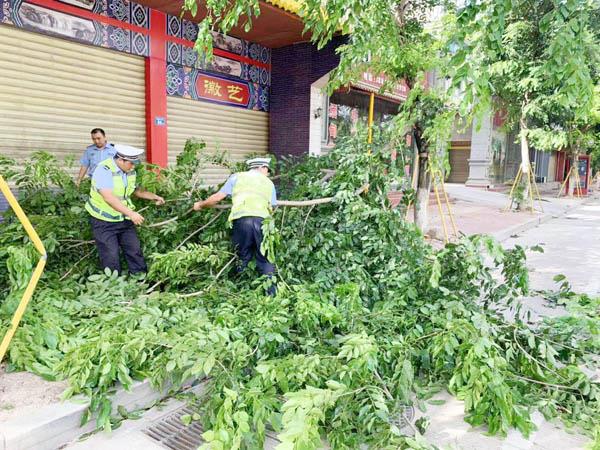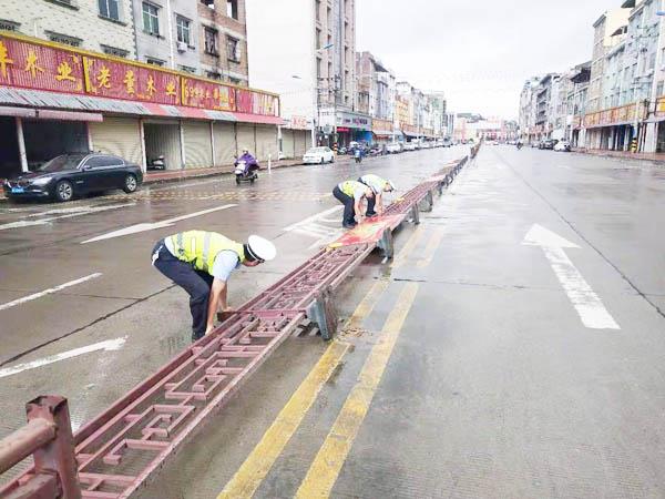为确保辖区道路交通安全,榜头交警中队全体民警、协勤人员在中队长郑奋彬的带领下,联合镇道安办、城管办等部门迎着暴风雨对辖区各个路段持续开展险情排查恢复交通秩序工作。231、241县道是辖区的交通要道,道路两侧的树木在台风中折断严重,隔离栏杆受损,山体滑坡等各种交通险情严重影响了交通的通行。8月24日、25日,正值台风登陆、风力最强劲之时,全体执勤人员坚守岗位,奔赴在一线抗台的路上,全力投入到清障工作中。在现场,民警不分昼夜撤离被风刮倒的树木、扶起横倒路中的栏杆、清理倒塌的广告牌,投放反光锥、指挥疏导交通,确保辖区主要道路安全畅通。有的冒着瓢泼大雨,在各处积水路段设卡拦截,引导过往车辆绕道通行;有的在积水处清理排水口杂物,尽快排泄洪水;有的协助推移涉水熄火的车辆,帮扶摔倒的骑车群众……俨然成了台风中一道亮丽的风景线。(时报记者 林锦堂 通讯员 郑奋彬)