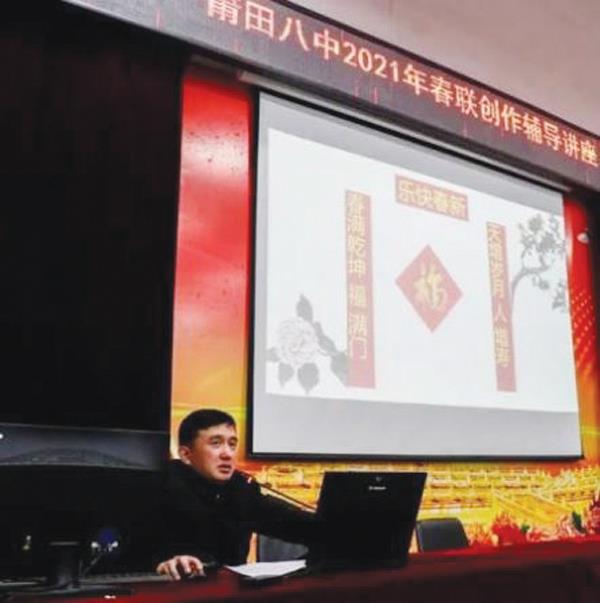莆田第八中学自2003年始开展楹联文化教育,成立了莆田八中楹联学社,制定了《莆田八中楹联教育五年规划》《莆田八中楹联教育年度工作计划》《莆田八中楹联学社章程》。在楹联教育过程中涌现出了一批优秀的楹联教师队伍,八中原校长祁明规是全国楹联教育理事、中国楹联学会教育基地联谊中心副主任、福建省楹联学会副会长、莆田市楹联学会前会长,祁朝洪老师是全国著名联师、福建省楹联学会会员、莆田市楹联学会现会长。此外,还有中国楹联学会会员9名,省楹联学会会员4名,市楹联学会会员20名。