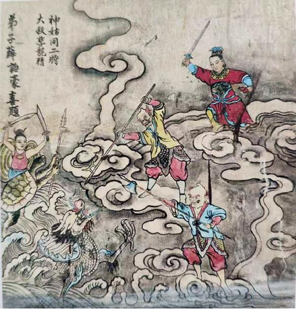灵慈庙壁画采用墨线为主,辅以矿彩平涂或晕染的手法,其中线条分为两种,一是匀硬坚挺的粗线,另一是圆润劲韧的细线。前者多以勾勒服饰外轮廓线,后者除用于外形塑造外,重点描绘了人物脸部的五官和头、手、脚部等结构。壁画运用简练活泼的线性语言,展现妈祖视觉图像的空间形式,以骨法用笔组织表现人物造型意趣,线条突破了顾、陆以来的“游丝描”笔法,创造并提炼成富有装饰视觉的“铁线兰叶描”,注意勾线的气势连接,在速度较快、压力较大的行笔过程中,虽“逸笔草草”,却给人一气呵成的感觉。不仅体现衣纹带褶如飞如动,而且构造人物形象传神写意,似雕塑般坚定而雄浑抒情的独特线描,具有安定、稳重、从容不迫的视觉效果。例如,壁画《巡游大海》《圣泉救疫》《化粮赈饥》《钱塘助堤》中的妈祖形象之头、手部,用极细匀工整的“铁线描”,衣纹、景物则以较大气流畅“兰叶描”意笔勾勒法,这种粗细变化与浓淡相间的墨线组织,把此物与它物的质量感较大程度地区别开来,加强了画面线条运用的视觉表现力。比如,壁画中的《孽龙作浪》描绘在云端妈祖的二大将发现孽龙精兴风作浪,欲掀翻船只及船上一片惶恐的场景;《大战孽龙》描绘妈祖和千里眼、顺风耳二将大战孽龙精、龟、蚌等,呈现出大海中厮杀及天昏地暗的场景。