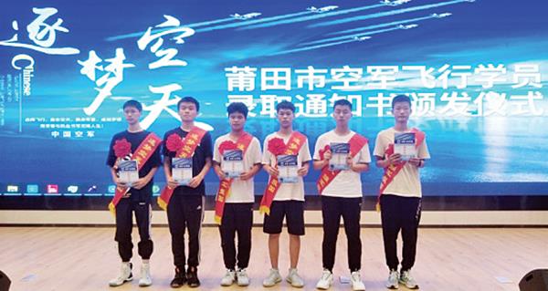 本报讯 日前,莆田市隆重举行了2021年空军飞行学员录取通知书颁发仪式。莆田第二中学黄志鹏和朱永兴、莆田第四中学黄怡凯、仙游第一中学杨昊、仙游县私立第一中学陈凌志、仙游金石中学郑旭辉,经过层层严格选拔,被中国人民解放军空军航空大学录取,光荣地成为了空军飞行学员,成为了航天英雄杨利伟的校友!