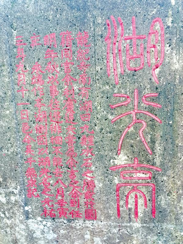 近代的墨客题写的“飞雨奔雷”为竖式行书镌刻,字径18厘米,笔锋俊俏有力,笔势苍劲挺拔;落款:吴县严家淦。“道家蓬莱”为竖式楷书镌刻,字径20厘米;落款:仙水龟城陈学礼施财立。