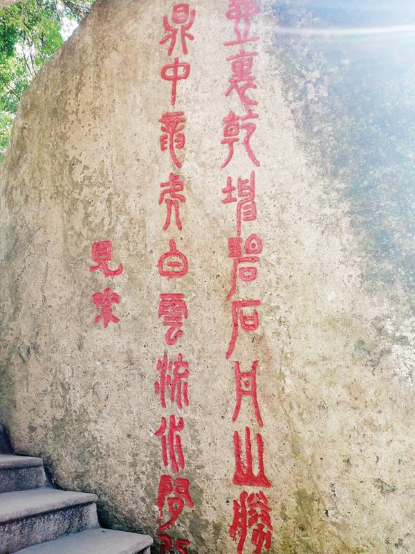 南宋“清源郡侯”陈谠题写的“天子万年”竖式楷书镌刻,字径90厘米,笔体雄健有力,充分体现了陈谠忠贞爱国的家国情怀。天子万年石,位于玉帝楼后之南侧,石壁峭立,如刀切斧劈,高约10米。明福建推官周世臣诗:“寂寂明时镜,斑斑宋代书;万年瞻赤鲤,高处有仙居。”