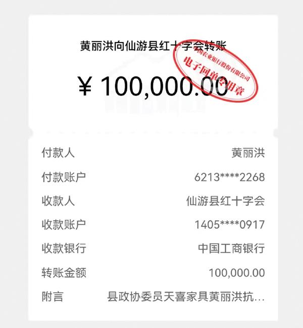 仙游籍民建会员、仙游县政协委员、福建天喜古典家具有限公司法人黄丽洪向仙游县红十字会捐赠10万元。