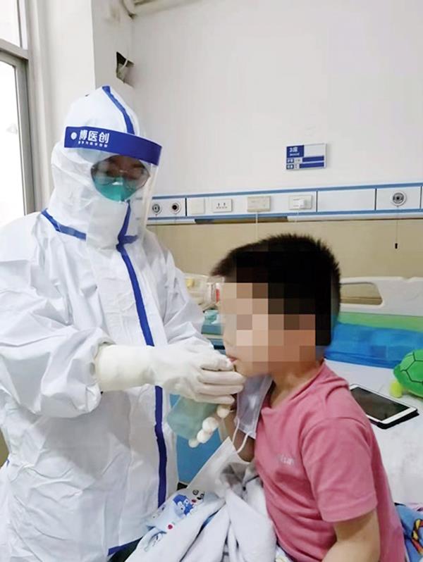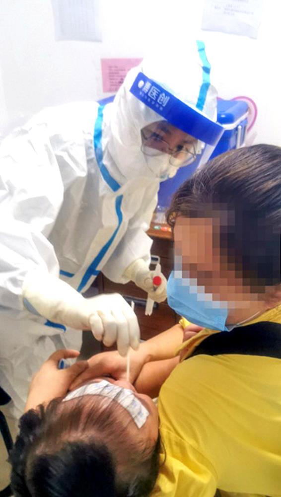 郑碧娟在发热门诊为就诊儿童采集核酸