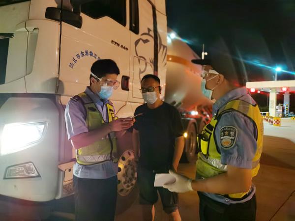 当日晚上24时整,张剑成等6名民辅警穿戴好防护服、护目镜、口罩,准时来到山亭高速路卡口,交接完毕后,带领交通等部门人员对过往的车辆进行检查、登记,他们这一班要设卡到早晨8点。