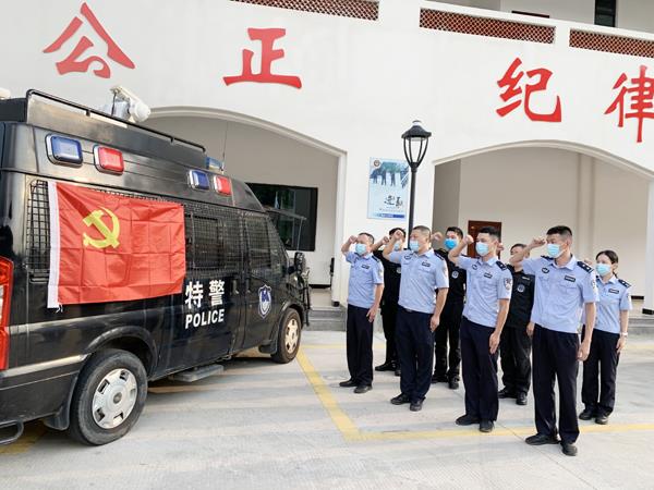 9月18日一早,第四支部在队党员整装列队,面向鲜红的党旗,高举右手,庄严重温入党誓词和入警誓词,全体人员进一步牢记共产党员的政治责任和历史使命,以更加饱满的热情当下的疫情防控工作,切实发挥共产党员的先锋模范作用。在宣誓后大家又纷纷投入当天各自的疫情防控任务中。