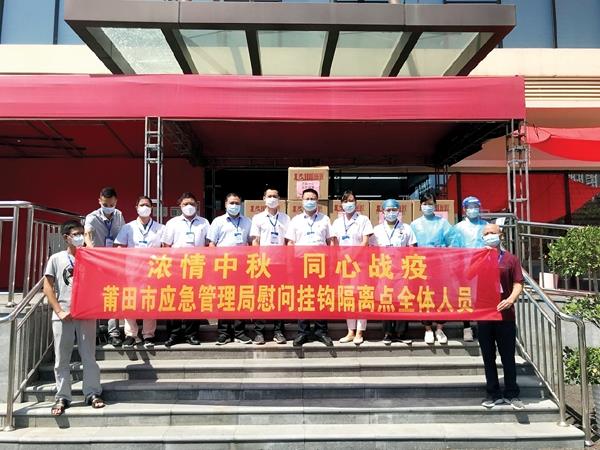 市应急局还积极协调福建省人民防空协会,送来210份中秋月饼,向所有医务人员、隔离人员、工作人员,送上节日问候和诚挚敬意,感谢他们逆风而行,守护一方平安。面对疫情,市应急管理局心系一线奋战的志愿者和医护人员,为“逆行者”撑起温暖“大后方”,同心协力打赢疫情防控歼灭战。