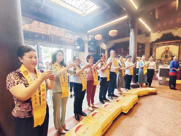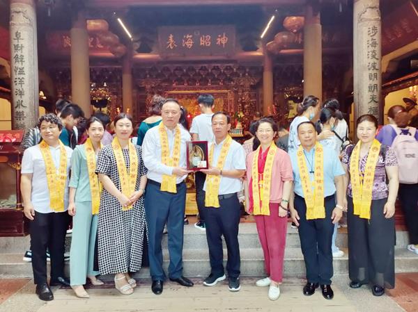 日前,山东省妈祖文化交流协会会长赵起良携协会成员7人前往湄洲妈祖祖庙朝圣进香。湄洲妈祖祖庙董事会董事长林金赞陪同众人在祖庙天后宫向妈祖行三献礼并赠送妈祖纪念品。