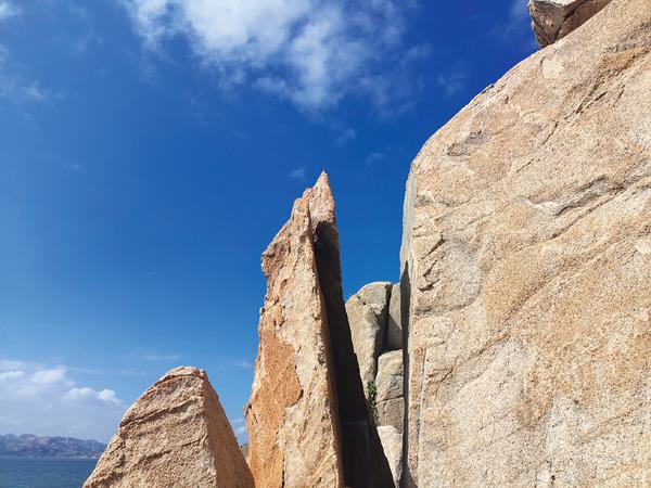 在石头山上,我们看到吴兄家的房子翻过山就到。山里人欧同志说,海岛的石头山不比山里的土山,翻不过去。我们只能原路返回。这海岸边的美丽步道,海浪海风相伴,来回走上几趟,也是不会腻。
