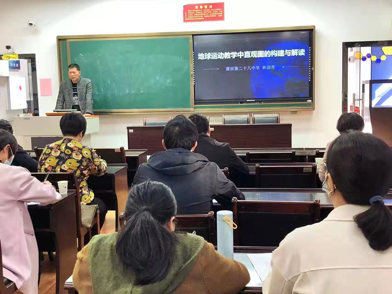 在讲座环节,市骨干教师、二十八中林劲芳老师为大家带来的讲座主题是《地球运动教学中直观图的构建与解读》。地球运动教学是高中地理最抽象最考验智商的教学篇目,学考班没有要求,即使是高考班,在多数老师的教学理念里也是尽量从简,因为毕竟对学生空间思维能力、想象能力及计算能力等都有较高的要求。作为市资深教师,林老师将自己的教学经验无私地与大家分享,通过绘制和解读各种直观图,使地球运动教学化动为静,变抽象为形象,分解分步,循序渐进,有效突破教学重难点,地理教学的绘图读图析图能力得到落实,学生的思维能力和智力得到提升,兴趣得到培养,一线教师多年的教学困惑得到化解。山外有山,人外有人。一名资深教师,能够潜心钻研教材,多年如一日地把自己的青春和智慧播撒在教学工作中,并将个人成果分享给大家,这需要怎样的胸怀和担当,让人心生敬仰。