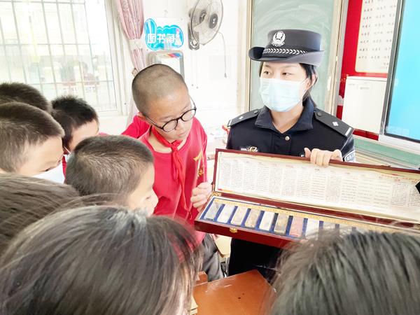 “同学们知道什么是毒品吗?知道毒品有哪些种类吗?”民警小蔡用通俗易懂,生动有趣的话语给同学们讲解禁毒知识、向同学们展示仿真毒品样品,让同学们认识毒品,了解毒品,远离毒品。民警小章:“同学们,你们熟悉的小零食,糖果、奶茶等等有可能是毒品伪装而成的,如果有人给你零食,一定要记得留个心眼分辨噢!”同学们纷纷表示惊讶,没想到毒品离自己这么近。禁毒宣传过后,民警们还给同学们进行反诈骗宣传,为了增强警民互动性,让反诈知识入心入脑,民警和小学生们一起拍了反诈小视频。