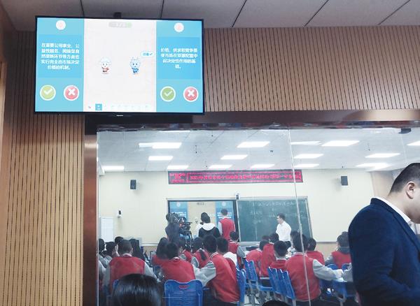 在冯国根老师的政治课堂上,学生们分组而坐,老师导入情境,学生们认真看笔记、小组讨论、回答提问、用智慧平板抢答……课堂交流中,交流互动、评价反馈即时化,每个学生都可以说出独特见解,同学可以补充。教室后的玻璃幕墙连接起隔间的观摩室,实时投映上课现场和课件。