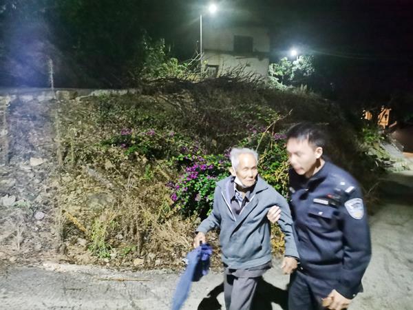 民警张天添在和老人的交谈中发现,老人由于独自外出步行太久且天色已晚,已记不清自己的家庭住址具体在哪里,精神状态也不太好,只知道自己的姓名,今年已经94岁了,自己一个人住。于是,民警张天添语气轻柔地用本地话安慰老人,别着急,我们一定安全把您送回家!于是,民警立即通过老人自报的姓名以及用警务通进行识别查找精准定位老人家的具体位置,并用警车热心护送老人回家,在警车无法通行的山路,民警张天添搀着小心翼翼地老人一步又一步前行……