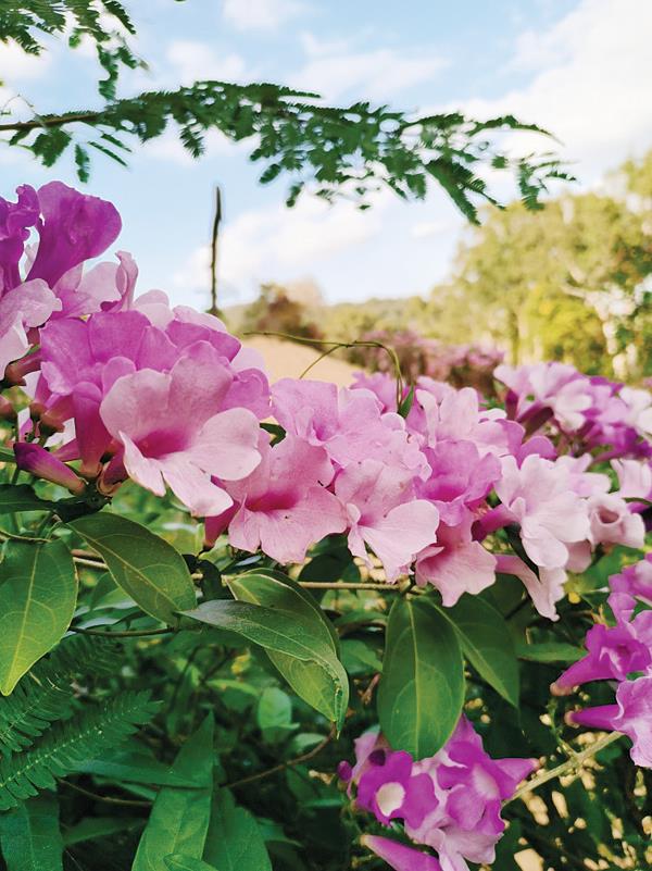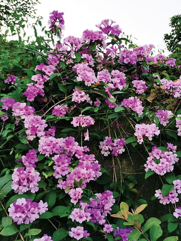 紫铃藤又名蒜香藤,因其花朵初开是紫色,如铃铛得名。紫铃藤的花有一个特点是能随着时间推移而变色。刚开时花为粉紫色,几天后慢慢转为粉红色,最后变成白色而掉落。 (时报记者 凌明信)