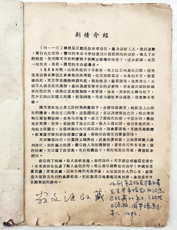翁先生出示的剧本是1960年5月4日铅印的“初稿”,由扮演陈天章的莆仙戏名角杨玉粦赠给翁先生收藏的。翁先生在首页“剧情介绍”之后写有一段话,珍爱之情跃然纸上: