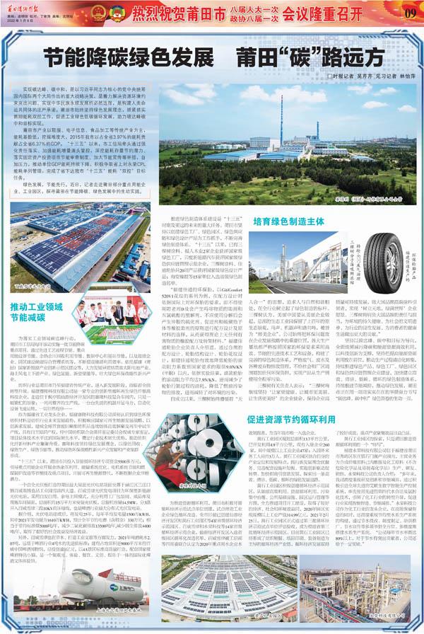 坚持以碳达峰、碳中和目标为导向,全面统领减污降碳和能源资源高效利用,以科技创新为支撑,坚持把提高能源资源利用放在首位,推动生产过程清洁化转型,持续推进绿色产品、绿色工厂、绿色园区和绿色供应链管理企业建设,加快建立高效、清洁、低碳、循环的绿色制造体系,持续推进节能减排,推动绿色发展,莆田市正在用一项项实实在在的举措奋力书写“碳达峰、碳中和”绿色答卷的生动一页。