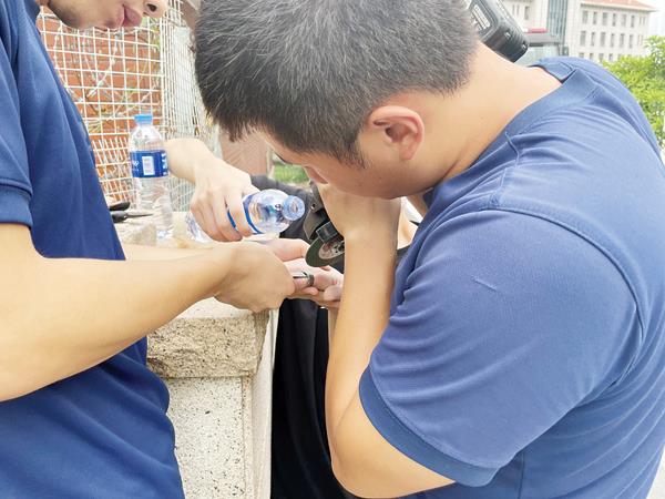 经过观察发现,该男子左手食指根部被一枚钢质戒指紧紧箍住,该钢戒密度大、硬度高,无法单独利用绝缘钳剪断,同时戒指卡在手指的时间过长,导致血液循环不顺畅,食指已经充血发青。根据男子被卡情况,两名经验丰富的指战员随地取材,利用矿泉水瓶剪了一块塑料垫片垫于钢戒与手指之间,避免剪切时受到二次伤害。随后,用角磨机将钢戒进行研磨切割,另外一名指战员取来净水不停对切割处进行喷水降温。由于戒指太硬,切割一个小口子也没法取下来,指战员立马改变策略,往钢戒间隙里垫上钢条,决定再切割一个“突破口”,经过15多分钟的处置,钢戒两端被锯开了两道豁口,指战员迅速拿出绝缘钳,通过锯开的小口子向两边扩张,“啪”的一声响,“咬手”的钢戒被成功取下。指战员当即嘱咐当事人立即前往就近医院处理伤口,以免进一步感染。