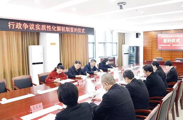 本报讯 为坚持和发扬新时代“枫桥经验”,共同推进行政争议实质性化解,保障人民群众的合法权益,促进依法行政,推动基层治理体系和治理能力现代化,1月12日下午,城厢区法院举行行政争议实质性化解机制签约仪式并召开座谈会,荔城区政府党组成员、二级调研员陈紫福,荔城区司法局局长张金荣以及城厢区法院党组书记、院长曾奋乐,党组成员、副院长余金灿,行政庭庭长何冠荔等参加会议。