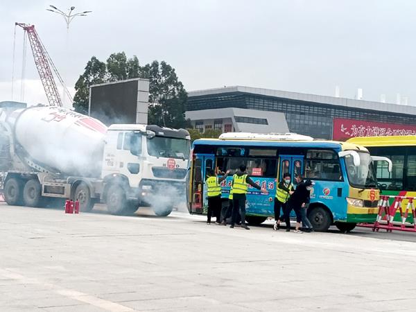 演练模拟一辆正常行进的公交车在拐弯时被后方一车速过快的混凝土搅拌车追尾,剧烈撞击后,公交车方向难以控制,车辆偏移与路上行道护栏剐蹭,导致车辆损毁严重,尾部冒烟、线路故障、车门变形难以打开,乘客被困车内,多名乘客不同程度受伤。事故占用3个车道,来往车辆较多,造成道路拥堵,乘客拍打车窗车门呼救,现场秩序一片混乱,情况十分危急。