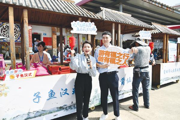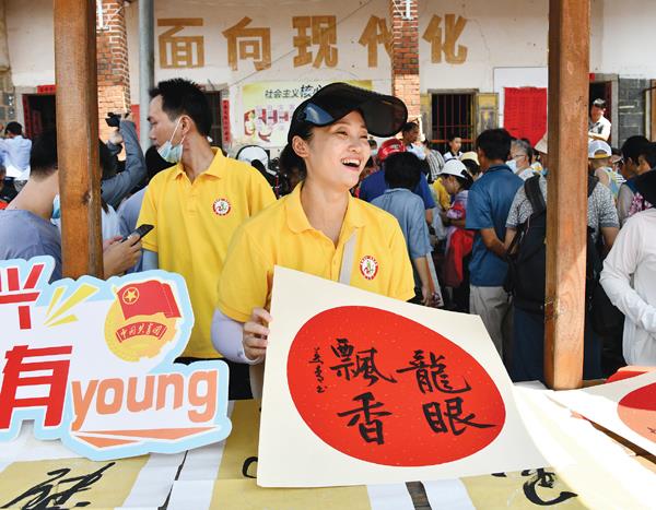 九月龙眼飘香,五彩萩芦迎福。当天的龙眼文化节,主办方发布了涵江区龙眼吉祥物IP、五彩萩芦品牌,并举行品牌授权签约仪式。活动现场热闹非凡,文创产品、农特产品等摊位大受游人喜爱。京东等电商平台应邀到场带货直播助农,助推乡村振兴。市人大书画院的书法家们还在现场挥毫泼墨送“福”,人气极旺。