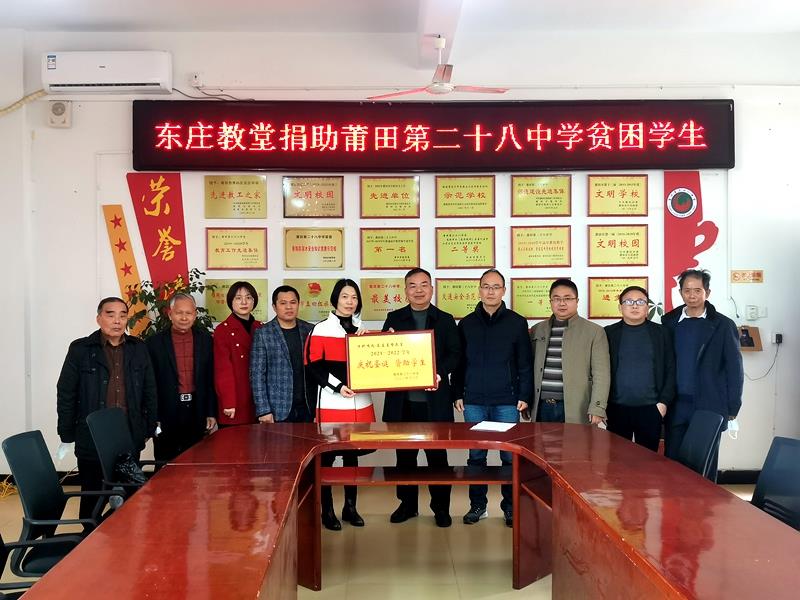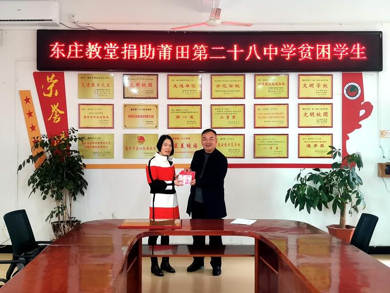 1月18日上午,秀屿区东庄基督教会吴碧桑传道一行来到莆田第二十八中学开展扶贫助学行动,为该校41位贫困学生带去爱心款41000元。这是东庄基督教会连续四年在该校开展的助学贫困学子活动,更好地弘扬了基督的博爱精神。