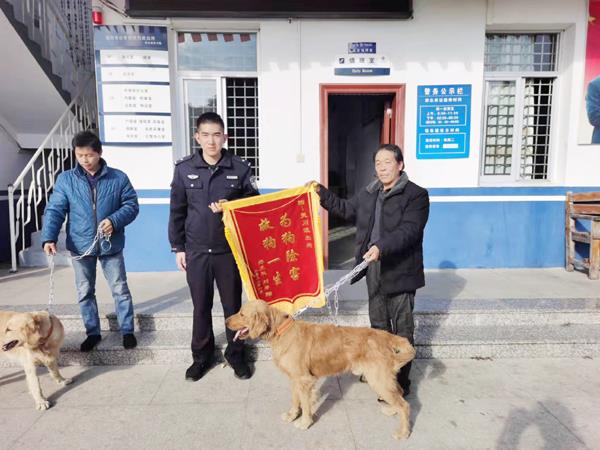 本报讯 1月19日下午,在办好交还手续后,辖区群众刘先生、郑先生牵着自己的爱犬,为热心帮助的民警送上锦旗表示感谢。