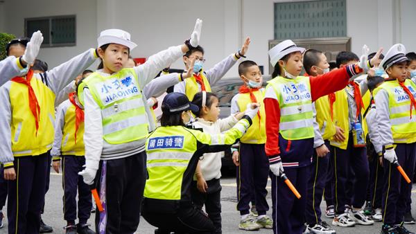 本报讯 近日,城厢交警大队组织开展“红领巾 小交警”警营开放日活动,邀请莆田市实验小学学生走进警营,向学生们宣讲交通安全知识。期间,事故中队民警带领学生参观快处中心、交通法庭、办案区,让学生了解交警部门快处快撤机制、法庭审判流程,通过身临其境让学生们体验违法犯罪的后果。随后,城厢女骑警在一中队大院内同学生们进行互动,向学生们们展示警用装备,让学生们体验交通情景模拟演示、标识游戏,在寓教于乐的活动中为学生们讲解交通法律法规及交通陋习的危害性。最后,女骑警开展指挥手势教学,让学生们了解交通指挥手势的含义,学会看交通手势信号,从而提高交通安全意识和自我保护意识。(陈慧敏)
