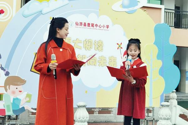 仙游县度尾中心小学校长吴明扬在启动仪式上,鼓励全体同学都积极地投入到读书月的各项活动中,以书籍为伴,以读书为乐,以读书为荣,在书海中汲取智慧的营养。