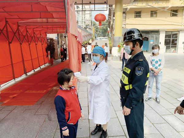本次演练在第一轮的演练的基础上,设置了学生上学进校秩序维持、体温异常学生处置及放学家长接送安全三个环节进行针对性的实操培训演练。演练中,所有参与的师生分工明确、井然有序,按照既定的方案流程,密切配合,准确高效地操练了常规管理重点与突发情况处置的方法。规范了疫情与安保应急事件的报告和处置流程,有效提高了师生应对突发事件的整体水平。