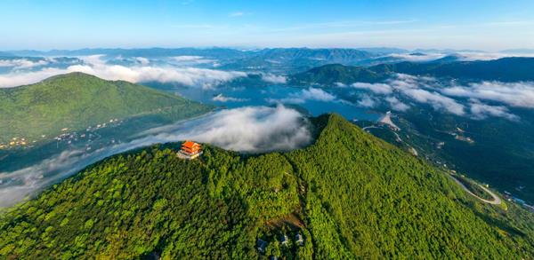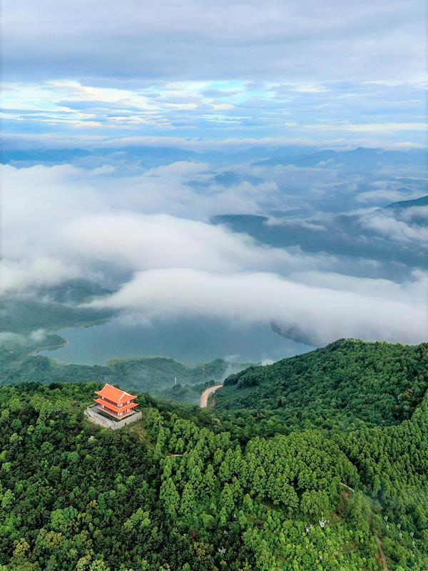 春夏之交,流云或自天马山腰涌上山顶的天马阁,或悠悠飘向东圳湖上空,云卷云舒。(摄影/许金珊)