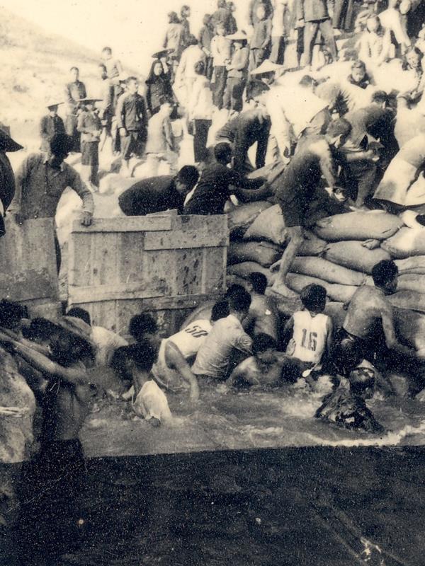 “水涨一寸,坝高一尺”,为了争取一切时间,英雄们在0℃严冬中,跳入冰冷的河水里突击堵口。(图片/莆田市东圳水库管理局提供)