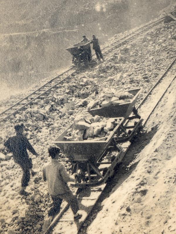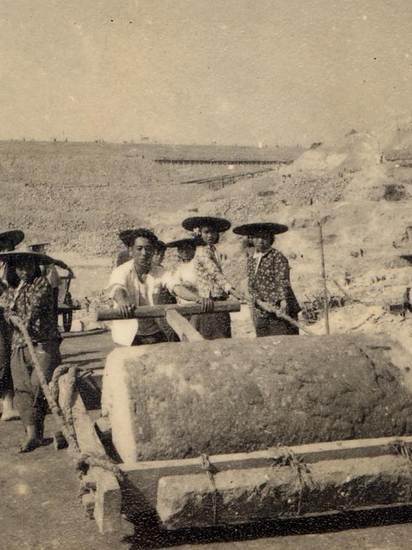 石滚碾压法、铁轨翻斗车、竹轨滑土法、自制木质拌灰机、木槽滑石法、空中送土法等新工具、新方法提高了施工效率。(图片/莆田市东圳水库管理局提供)