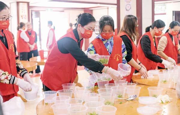 为保障午餐及时供应,祖庙食堂一大早便开始筹备工作,60多位祖庙妈祖义工早早在食堂集合,众人齐心协力,各司其职,或盛饭,或装盒……一片热火朝天。除了主食油饭和配汤鱼丸紫菜汤外,祖庙董事会还准备了哈密瓜、沃柑和圣女果作为餐后甜点。