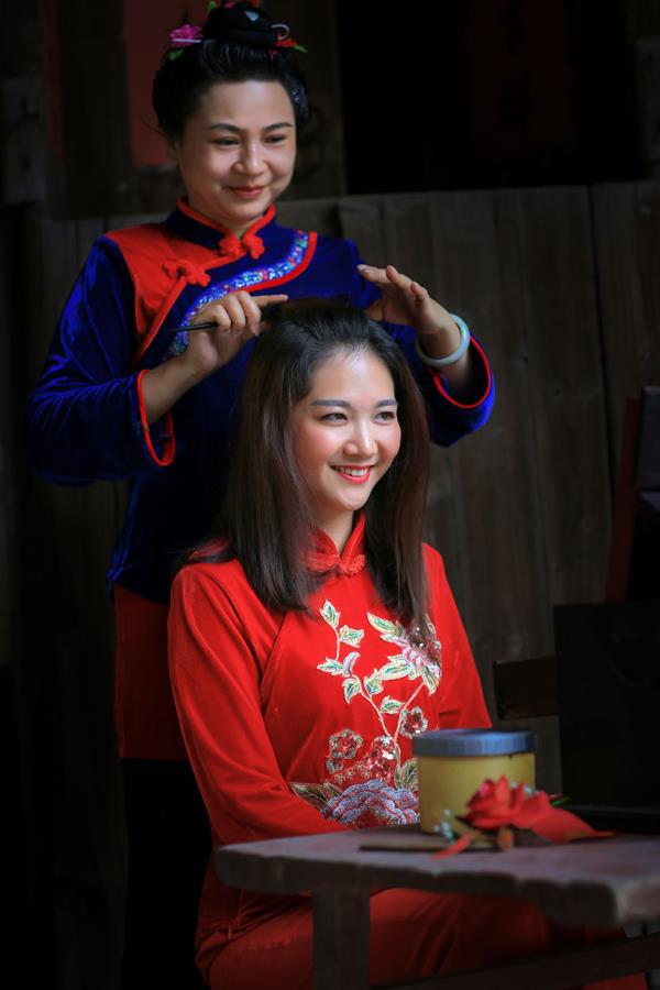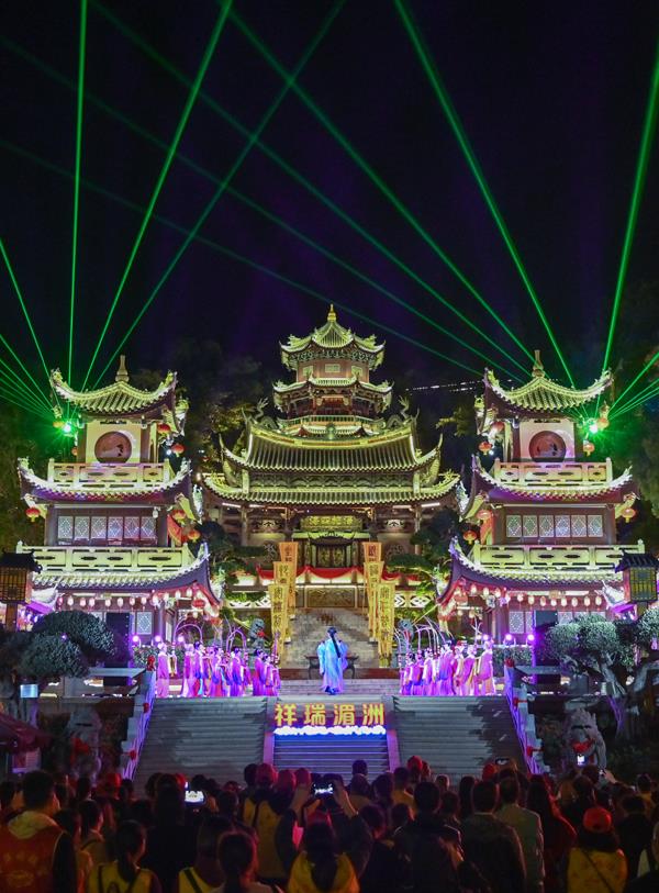 以湄洲妈祖祖庙为背景的歌舞秀实景演出,呈现浓郁的湄洲风情、虔诚的妈祖信俗和庄严的妈祖祭典。(摄影/高亚成)