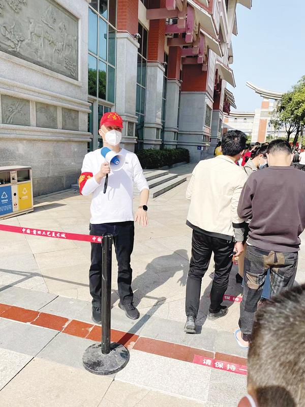 市政协委员、莆田市融艺堂工艺品有限公司艺术总监、总经理李辉加入黄石工艺美术城志愿者队伍,维持现场秩序和指导群众填报信息等工作。