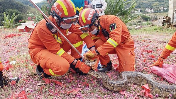 本报讯 2月11日中午13时29分许,涵江消防大队康南消防站接到村民报警称,在大洋乡满长村农场附近发现一条大蟒蛇,接到报警后,康南消防站立即出动1辆抢险救援车和6名消防救援人员赶赴现场处置。