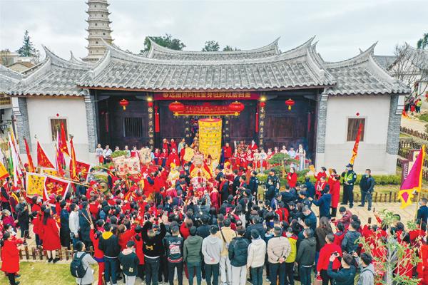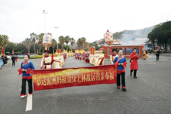 两岸同胞相聚湄洲,同谒妈祖共庆元宵。10日上午9时许,在两岸宫庙代表、妈祖信众的簇拥下,妈祖金身缓缓起驾,开始本次返乡省亲布福。舞龙队、车鼓队、仪仗队、仪卫队等特色民俗阵头组成浩浩荡荡的队伍,从妈祖祖庙出发,沿着湄洲大道向天妃故里遗址公园行进,沿途吸引了众多群众、游客夹道欢迎和驻足观看,妈祖金身所经之处,家家恭迎圣驾,户户焚香祷告。上午10时许,队伍抵达天妃故里遗址公园,祖庙董事会依照东蔡村接妈祖闹元宵习俗举行接驾仪式,恭请妈祖金身驻跸妈祖故居。“这是我第一次在湄洲岛体验元宵氛围,对‘十里不同风,一村一习俗’这句话有了切身体会,也再次感受到了同胞的热情与关怀,心里倍感温暖。”在现场,来自台湾省彰化县福兴乡皇圣宫副主委陈清鋐说。
