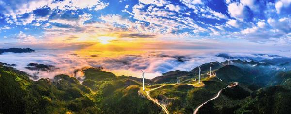 福建首个内陆风电场落户于此,创造了一个福建第一!在平均海拔1073米的山脉上,单机容量1.5兆瓦的23台风力发电机傲然挺立,蔚为壮观。青山、蓝天、云海、夕晖以及樱花仙境,美不胜收,构成了这个新晋网红打卡之地的最美风景。(摄影/张颖)