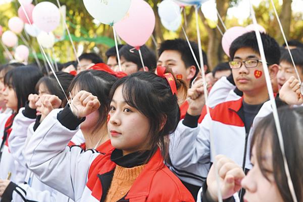铿锵有力的口号声、激情澎湃的《我相信》、腾飞梦想的彩色气球,让全场师生热血沸腾。年段长高举“必胜”旗帜带领高三学子跨状元门、礼拜孔子、挂心愿条、祈福高考。 (林馨妤 詹璐 郑育俊)