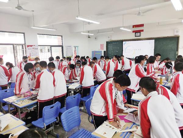 据介绍,“八步四导”是由学生自主学习的“情境创设——问题生成——自主学习——小组合作——自主生成——展示评价——自主构建——新情境迁移”八个步骤和教师引导启发的“导入——导学——导评——导悟”四个环节构成。这种教学模式强调了三个重要环节,一是情境创设,教学以情境创设始,以新情境迁移终,培养应对复杂真实情境的问题解决能力。二是强调学生的自主学习。学生通过独立思考探究与小组同伴合作,自主进行概念形成、体系构建、能力的养成。三是强调教师的引导,教师的导重在启发、点拨。导的重点一是学生学习方法的建立,二是调节学生自主学习的方向,三是导在学生知识经验脱节之处,导在思考发生障碍之处,导在方法总结提炼、知识升华之处。