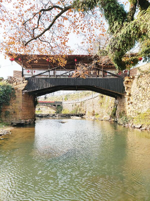 从时光深处走来的溪边廊桥,典雅华美,自然地融入菜溪岩山水间,成为最有生命的古建奇葩。这座孤独存世、集亭台楼阁为一体的木拱廊桥,连同桥畔百年乌桕倒映清波的梦幻红叶,及蓝天、白云、山川、村镇、农舍构成醉人的乡村绮景,吸引不少游客跋涉而来品味。