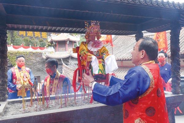 升幡挂灯仪式后,湄洲妈祖祖庙董事会董事长林金赞为“天下妈祖回娘家”启动仪式开锣,随着响亮的锣声响起,11名鼓手同时擂动大鼓,50名旗手随鼓声摇动龙旗。在雄壮的鼓声与飘扬的旗帜里,林金赞董事长引领柳政鸿等11位在岛海峡两岸妈祖敬仰者代表恭请分灵妈祖拾阶走向祖庙天后宫,并在天后宫内举行平安祈福仪式,共同为战胜疫情祈福。